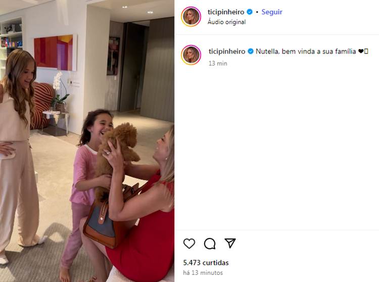 Em seu perfil no Instagram, Ticiane compartilhou os primeiros momentos da cachorrinha e deu as boas-vindas à ela. Ela mostrou ainda as primeira reações do novo membro da família no apartamento. “Nutella, bem vinda a sua família”, escreveu na legenda do vídeo com a pet da raça poodle.