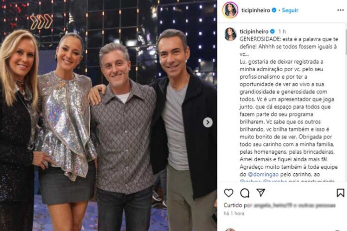 Para completar, Ticiane agradeceu à Record por tê-la liberado para participar do “Domingão”. “Amei demais e fiquei ainda mais fã! Agradeço muito também a toda equipe do @domingao pelo carinho, ao @gshow e @tvglobo pela oportunidade de viver tudo isso, e à minha emissora querida @recordtvoficial pela liberação”, disse na legenda da publicação.