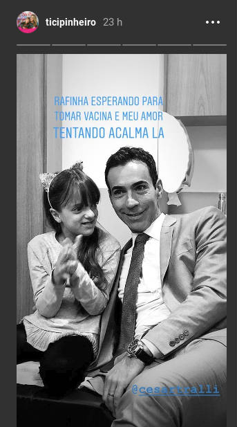 Na imagem compartilhada pela famosa, ela escreveu que Cesar estava tentando acalmar a filha. “Rafinha esperando para tomar vacina e meu amor tentando acalmá-la”, escreveu.
