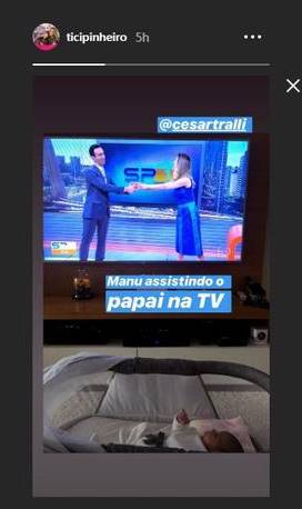 Manu assistindo ao papai na TV”, escreveu Ticiane, na foto, que foi vinculada em seu stories do Instagram.