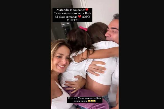 “Matando as saudades. Cesar estava sem ver a Rafa há duas semanas. Amo muito. E eu e a Manu sem ver a Rafa desde sexta”, escreveu na legenda. Cesar estava viajando de férias e Rafaella não pôde ir com ele devido ao aniversário de quatro anos da irmã caçula, Vicky, herdeira de Justus e Ana Paula Siebert.