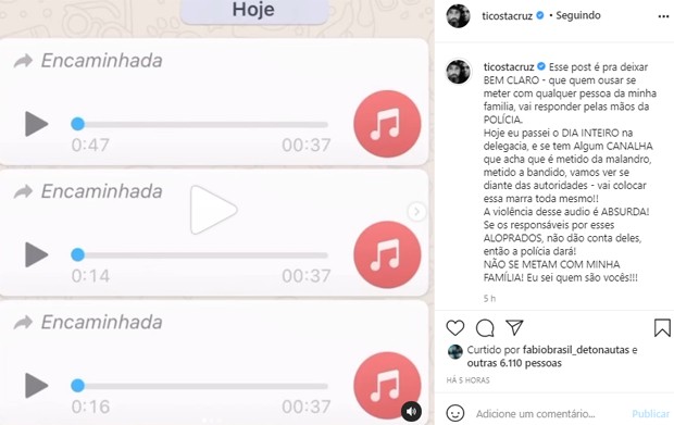 Sendo assim, ele finaliza. “A violência desse áudio é ABSURDA! Se os responsáveis por esses ALOPRADOS, não dão conta deles, então a polícia dará! Dessa forma, NÃO SE METAM COM MINHA FAMÍLIA! Eu sei quem são vocês!!!”, disse.