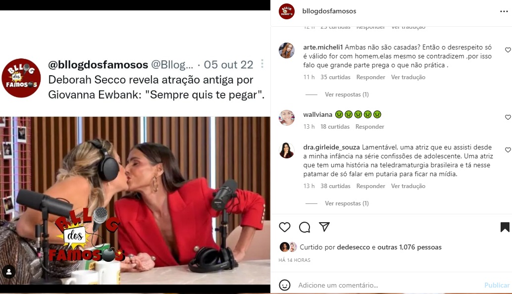 Ao que tudo indica, a web não gostou nadinha das atitudes de Deborah Secco. Desse modo, por meio de comentários, eles deixaram as suas opiniões: “Ambas não são casadas? Então o desrespeito só é válido for com homem, elas mesmo se contradizem, por isso falo que grande parte prega o que não prática”.
