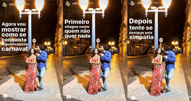 Túlio compartilhou alguns registros do casal em seu InstaStories e postou até uma brincadeira que fez com a amada. Ele publicou uma sequência de imagens dos dois em uma rua, à noite, e brincou de dar dicas de conquista no carnaval.