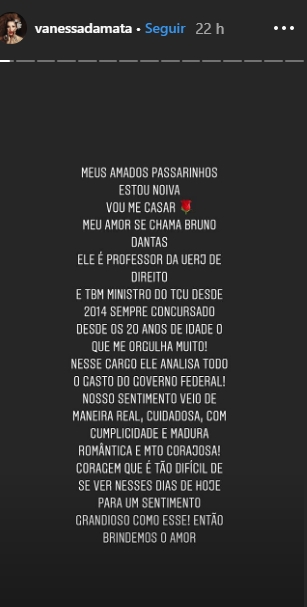 “Estou noiva. Vou me casar. Meu amor se chama Bruno Dantas. Nosso sentimento veio de maneira real, cuidadosa, com cumplicidade, maduridade romântica e muito coragem! Coragem, que é tão difícil de ser ver nesses dias de hoje para um sentimento grandioso como esse. Então, brindemos o amor!”, postou ela.