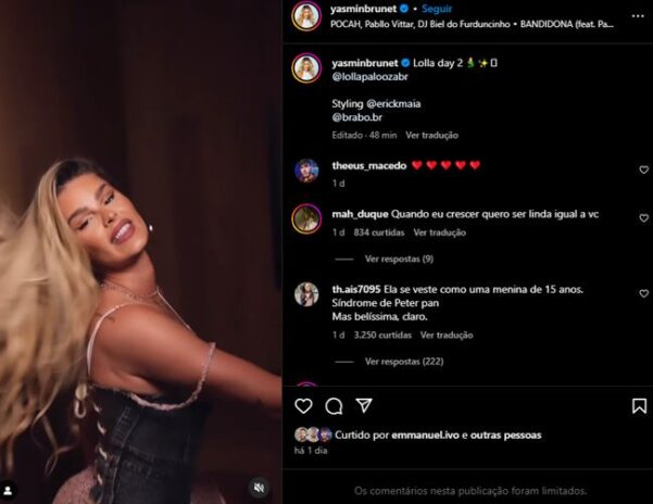 A atriz, modelo e ex-participante do Big Brother Brasil 24, Yasmin Brunet, 35 anos, recebeu um comentário de um internauta em uma de suas redes sociais que causou o maior burburinho na web. Na situação, a pessoa em questão disse que a loira estava ”velha demais para rebolar”. Sendo assim, ela rebateu a declaração e impressionou com a resposta.