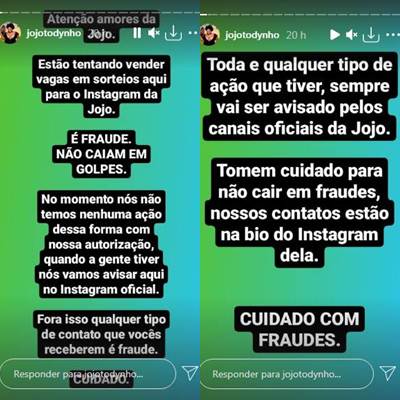 No post seguinte, a equipe continuou. “Toda e qualquer tipo de ação que tiver, sempre vai ser avisado pelos canais oficiais da Jojo. Tomem cuidado para não cair em fraudes, nossos contatos estão na bio do Instagram dela. Cuidado com Fraudes”, continuou.