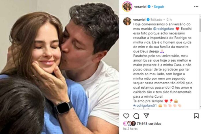 “Hoje comemoramos o aniversário do meu marido @rodrigofaro ❤️ Escolhi essa foto porque acho necessário ressaltar a importância do Rodrigo na minha vida. Ele é o homem que cuida de mim e da sua família da maneira que Deus deseja 🙏🏻”, iniciou Vera Viel a legenda da sua publicação.