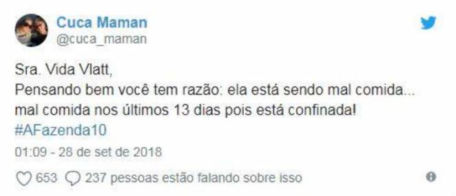 Quem não gostou nada da declaração de Vida, foi o namorado de Ana Paula, isso porque, a eliminada do reality rural, disse que a ex-BBB era ‘mal-comida’. Em seu Twitter, Rudimar de Maman se manifestou: “Sra. Vida Vlatt, pensando bem, você tem razão: ela está sendo mal comida nos últimos 13 dias, pois está confinada!”, publicou ele.