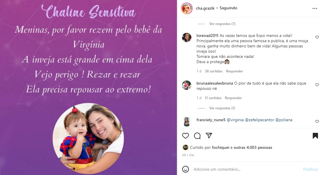“Deuses e deusas, como falei na live, o bebê da @virginia está sofrendo risco, devido a inveja. Faço um pedido a vocês, vamos fazer uma corrente de oração para ela! Que essa criança venha ao mundo com saúde e não lhe aconteça nada!”, escreveu a Clarividente Chaline em sua postagem.