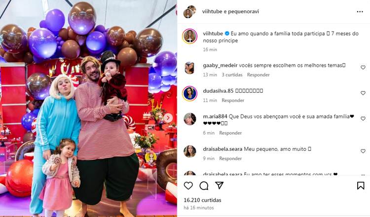 Em seu perfil oficial no Instagram, Viih Tube compartilhou os registros da comemoração. “Eu amo quando a família toda participa! 7 meses do nosso príncipe”, escreveu a mamãe coruja na legenda do post.