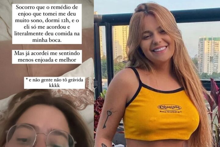 Contudo, ao atualizar os seus seguidores sobre o avançar de sua recuperação, Viih Tube deixou claro que não está grávida. A influenciadora digital contou que vem tomando medicamentos contra enjoo, os quais lhe deram como efeitos colaterais intensas sonolências. “Socorro, que o remédio de enjoo que tomei me deu muito sono. Dormi 12 horas e o Eli [Eliezer] só me acordou e deu literalmente comida na minha boca”, explicou. “Mas já acordei me sentindo menos enjoada e melhor. E não, gente, não tô grávida!”, asseverou.