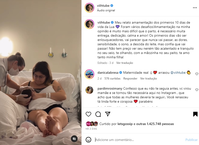 Em seu Instagram, Viih Tube também contou como foi difícil realizar a amamentação de Lua. Assim, deixou claro que os primeiros dias foram um tanto quanto enlouquecedores. “Meu relato amamentação dos primeiros 10 dias de vida da Lua. Foram vários desafios!Amamentação na minha opinião é muito mais difícil que o parto, é necessário muita entrega, dedicação, calma e amor!”, declarou.
