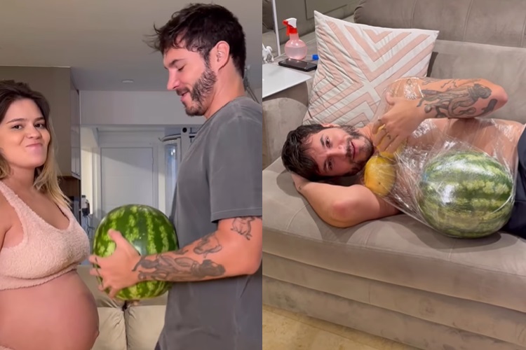 No vídeo em questão, Viih Tube coloca uma melância na barriga do seu companheiro para simular a gravidez: “Ele não aguentou nem 20 minutos com a barriga fake dele tá KKKKK”, declarou.