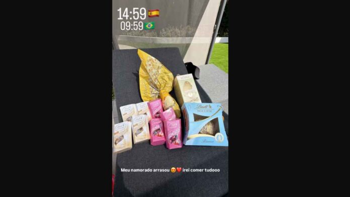 “Meu namorado arrasou, irei comer tudo”, afirmou a influenciadora. Ela passou a manhã organizando a festa temática de Páscoa para os filhos na mansão de Vini, em Madri.