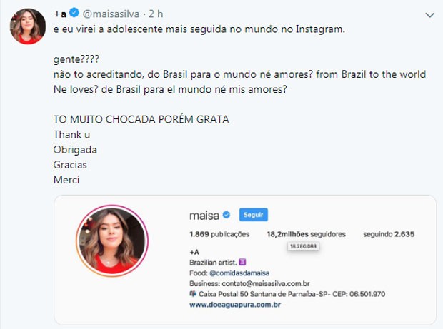 “E eu virei a adolescente mais seguida no mundo no Instagram. Gente? Não tô acreditando, do Brasil para o mundo, né mores? Tô muito chocada, porém grata”, comemorou.
