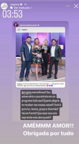 A apresentadora ainda republicou um post de Patrícia Abravanel que a parabenizou pelo seu trabalho e aniversário. Na publicação, a filha de Silvio Santos comentou: ”Seu aniversário e a sua estreia em um programa todo seu!! Quanta alegria te receber nas nossas casas!!! Você é pura luz, leveza, graça e diversão!! Vai em frente!! Que esse novo ano seja ainda mais abençoado!!”, pontuou. Virgínia respondeu: ”Amém amor! Obrigada por tudo”, exclamou.