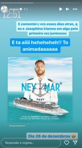 Em sua conta oficial do Instagram Stories, a mulher contou mais detalhes sobre o ‘Ney em alto Mar’. Ela expôs que irá pela primeira vez, ao lado do seu marido, para o evento que durará três dias. O cruzeiro do atleta irá acontecer entre os dias 26 e 29 de dezembro e contará com sua participação neste meio tempo.