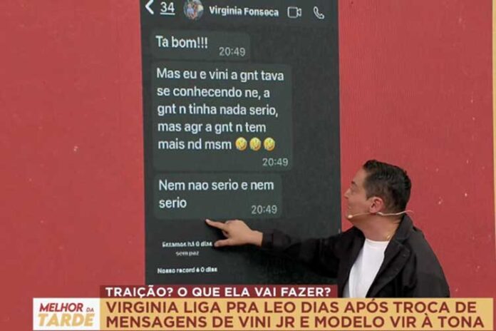 Durante o programa “Melhor da Tarde”, desta terça-feira (07), Leo Dias trouxe informações inéditas sobre o suposto affair entre Virginia Fonseca e Vini Jr. O jornalista exibiu um print recebido da influenciadora, em que ela afirma não “ter mais nada com o jogador”.