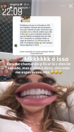 Nos stories, Virginia Fonseca também desmentiu os rumores de que estaria brigada com seu assessor e amigo de longa data, Hebert Gomes. Em seguida, a apresentadora compartilhou a mensagem de uma seguidora que refletia sobre o fato de ela não estar curtindo tanto a vida social, especialmente depois de dispensar o rolê.