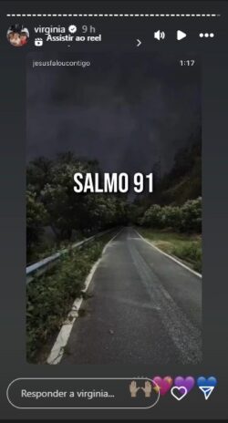 Em seguida, comovendo todos seus milhares de seguidores, Virginia compartilhou uma passagem bíblica, mesmo diante da internação de sua filha, mostrando sua fé no soberano Senhor! “Aquele que habita no abrigo do Altíssimo descansará à sombra do Todo-poderoso. Direi do Senhor: ‘Tu és o meu refúgio e a minha fortaleza, o meu Deus, em quem confio’“, diz parte dos versículos de Salmo 91.