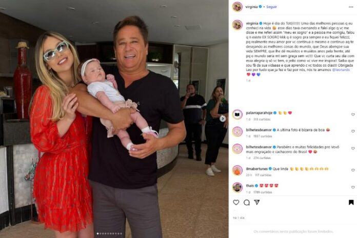 A influenciadora digital Virginia Fonseca deixou sua separação de Zé Felipe de lado e enalteceu o ex-sogro Leonardo em homenagem na última sexta-feira, 25 de julho, dia do aniversário de 62 anos do sertanejo renomado, demonstrando que há muita admiração por ele ao afirmar que o veterano da música brasileira é uma das melhores pessoas que conheceu na vida.