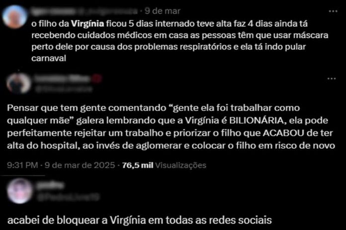 Outra, disse que ao participar da folia, Virginia estaria “colocando o filho em risco”, após ele ter sido internado com quadro de bronquiolite. “Pensar que tem gente comentando: ‘Gente, ela foi trabalhar como qualquer mãe’. Galera, lembrando que a Virgínia é bilionária. Ela pode perfeitamente recusar um trabalho e priorizar o filho, que acabou de receber alta do hospital, em vez de aglomerar e colocá-lo em risco novamente”, disse a internauta.