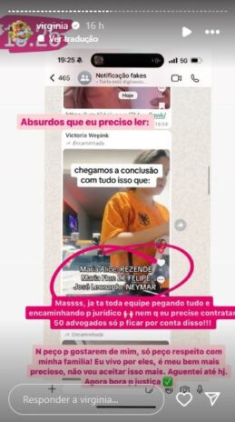 A influenciadora compartilhou uma publicação a qual uma pessoa afirma que Virginia Fonseca teve Maria Alice com Rezende, Maria Flor com Zé Felipe e José Leonardo com Neymar: “Absurdos que preciso ler. Mas, já tá toda a equipe pegando e encaminhando tudo para o jurídico nem que eu precise contratar 50 advogados só para ficar com conta disso”, disparou ela, ao compartilhar o post cruel.