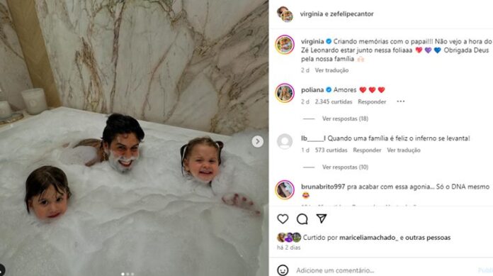 Mega apaixonada pelo marido e filhas, Virginia voltou a encantar os seguidores ao publicar mais uma edição do ‘criando memórias’ antes do nascimento do terceiro herdeiro, José Leonardo. No feed do Instagram, ela mostrou a diversão das filhas com o papai Zé Felipe, curtindo um delicioso banho de espuma na banheira.