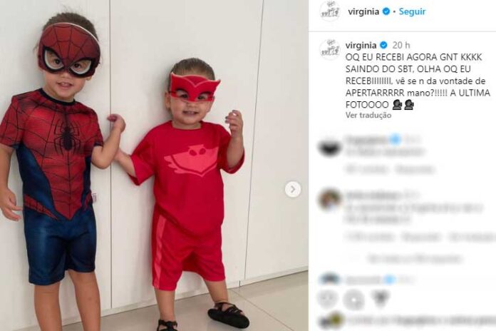 Maria Alice e Maria Flor visitaram a mãe vestidas com uniformes de super-heróis. Virginia se derreteu na legenda, destacando que teve que compartilhar em seu feed o momento fofo protagonizado pelas herdeiras, fruto de seu casamento com Zé Felipe.