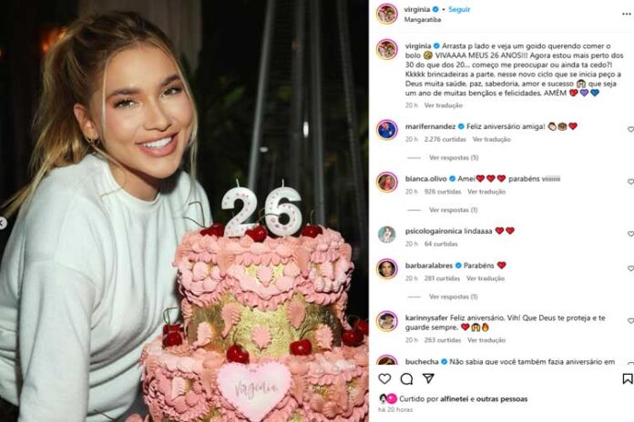 “Viva! Meus 26 anos! Agora estou mais perto dos 30 do que dos 20… Começo a me preocupar ou ainda está cedo? Brincadeiras à parte, neste novo ciclo que se inicia, peço a Deus muita saúde, paz, sabedoria, amor e sucesso Que seja um ano de muitas bênçãos e felicidades. Amém!”, disse Virginia.