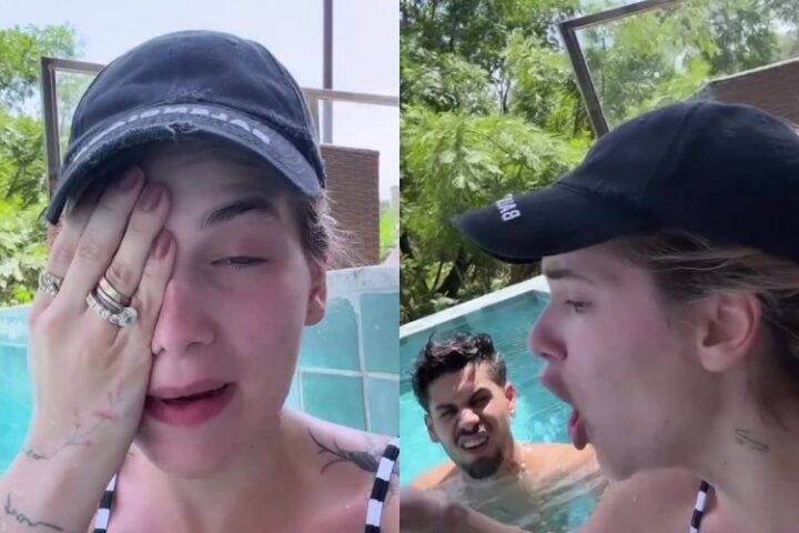 “Galera, entramos na água para refrescar. Vocês não têm noção o tanto que essa água está quente do calor. Ela está quente. Eu tô passando mal aqui dentro, eu tô sentindo calor”, desabafou a loira.