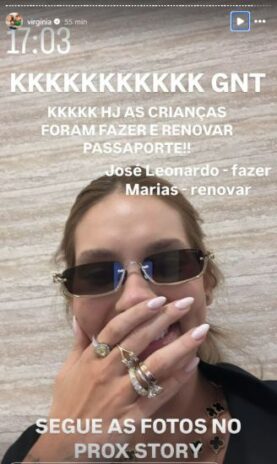 “Gente! Hoje, as crianças foram fazer [José Leonardo] e renovar [Maria Alice e Maria Flor] o passaporte”, contou Virginia, exibindo as fotos logo em seguida, diretamente dos stories do Instagram.