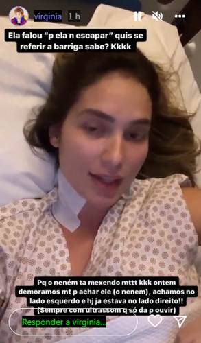 A influencer ainda fez vários stories falando sobre a gestação. “O neném tá mexendo muito, ontem demoramos muito para achar ele (o nenem), achamos no lado esquerdo e hoje já estava no lado direito! (Sempre com ustrassom que só dá para ouvir)”, disse ela, que ainda revelou que mesmo assim não sabe o sexo do bebê.