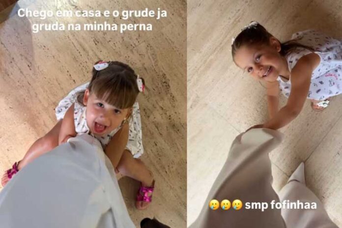 Ela mostrou a primogênita animada agarrando sua perna. “Chego em casa e o grude já gruda na minha perna”, revelou a apresentadora do “Sabadou” mostrando o carinho das herdeiras. O casal assumiu romance em outubro, após a mídia apontar rumores sobre possível affair. O jogador chegou a pedir desculpas públicas após cometer um “deslize” com a famosa.