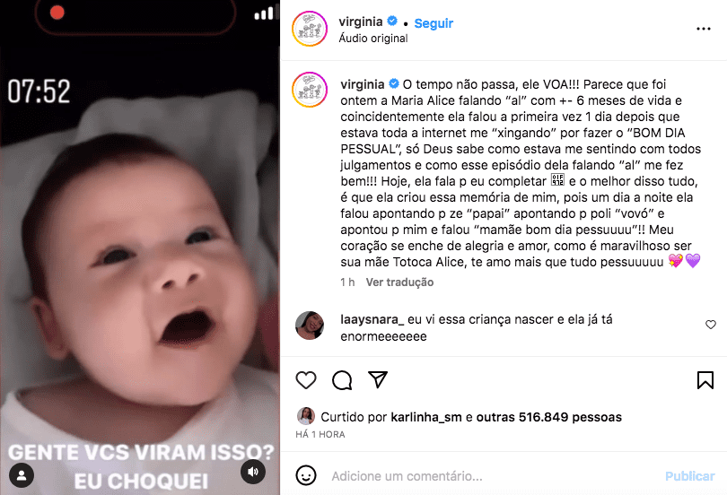 “O tempo não passa, ele VOA!!! Parece que foi ontem a Maria Alice falando ‘al’ com mais ou menos 6 meses de vida e coincidentemente ela falou a primeira vez 1 dia depois que estava toda a internet me ‘xingando’ por fazer o ‘BOM DIA PESSUAL’, só Deus sabe como estava me sentindo com todos julgamentos e como esse episódio dela falando ‘al’ me fez bem!!!”, contou.