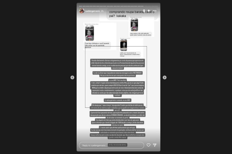 “Recebo diariamente ofensas e xingamentos por conta da pessoa que apareceu em mídia falando bonito e dizendo que é pai, e no off estava fazendo igual muitas pessoas vieram fazendo comigo. Se eu recebo isso de pessoas que não me conhecem, é por causa dele” – escreveu Suelen em seus stories.