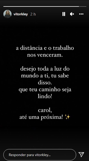 “A distância e o trabalho nos venceram. Desejo toda a luz do mundo a ti, tu sabe disso. Que teu caminho seja lindo! Carol, até uma próxima!”, escreveu o cantor.