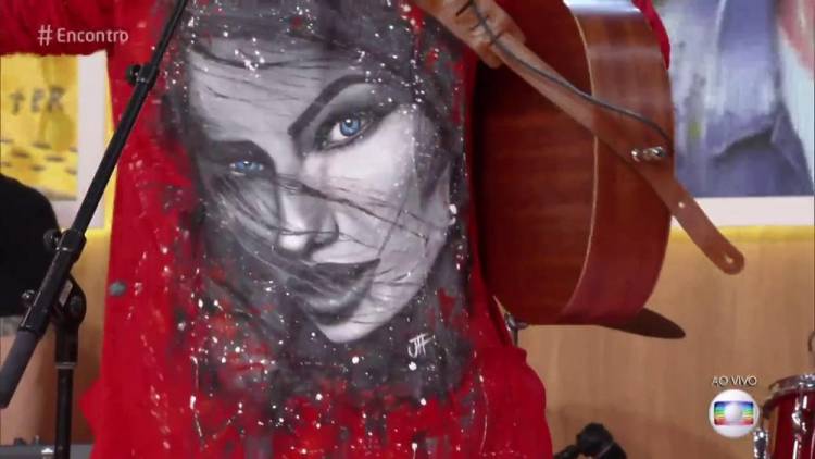 O cantor, em tom de brincadeira, contou que estava com vergonha de falar sobre Gabriela. Depois ele mostrou um casaco vermelho que tem estampado o rosto da cantora.