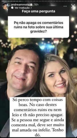 Na sequência da interação, Andréa Mota foi questionada sobre sua reação diante dos comentários ofensivos de que é alvo. Nas redes sociais, a modelo foi bastante criticada quando anunciou a gravidez aos 47 anos, com muitos haters insinuando que isso seria perigoso, ou que ela não estaria na idade para ser mãe novamente.