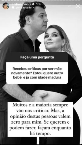 Andréa Mota ainda encorajou as mulheres que, na mesma faixa etária, sonham com a gravidez. Segundo ela, as pessoas devem perseguir os seus sonhos sem dar importância para as críticas alheias.