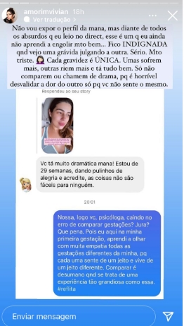 “Diante de todos os absurdos que eu leio no direct, esse é um que eu ainda não aprendi a engolir muito bem. Fico indignada quando vejo uma grávida julgando a outra.”