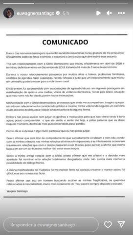Wagner pontua: ”Ontem, fui surpreendido com as acusações de agressão/abuso em algumas postagens em manifestação de apoio a uma mulher, vítima de violência doméstica, feitas pela Gleici, situação que meu nome não foi citado, porém houve insinuações”, disse. E complementa: ”Minha relação com a Gleici desencadeou processos que ainda me acompanham, imagino que por ter sido um relacionamento considerado público e mesmo minha vida tendo seguido um caminho muito distante do dela, essa relação ainda reverbera de alguma forma”. Confira o comunicado completo abaixo!