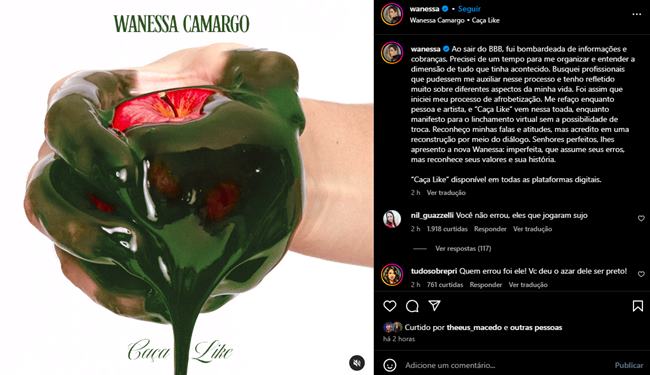 Por fim, ela admite seus erros, mas os reconhece: ”Ao sair do BBB, fui bombardeada de informações e cobranças. Precisei de um tempo para me organizar e entender a dimensão de tudo que tinha acontecido. Busquei profissionais que pudessem me auxiliar nesse processo e tenho refletido muito sobre diferentes aspectos da minha vida. Foi assim que iniciei meu processo de afrobetização. Me refaço enquanto pessoa e artista, e “Caça Like” vem nessa toada, enquanto manifesto para o linchamento virtual sem a possibilidade de troca. Reconheço minhas falas e atitudes, mas acredito em uma reconstrução por meio do diálogo. Senhores perfeitos, lhes apresento a nova Wanessa: imperfeita, que assume seus erros, mas reconhece seus valores e sua história”, escreveu.