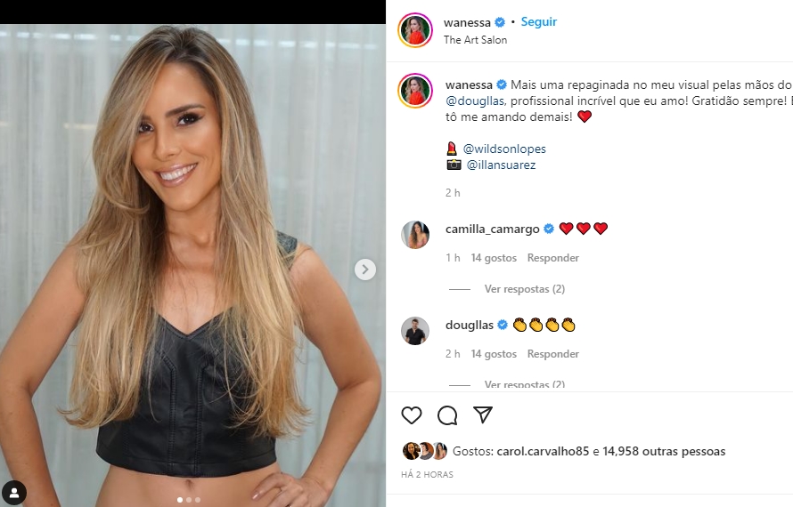 “Hoje foi dia de beleza! A gente veio fazer uma coisa que a gente devia ter feito quando a gente fez a cor. Dar uma retocada na raiz e dar a quebra do fundo, agora a gente fez. Ficou mais bonito do que já estava. Deixamos um pouco mais dourado. Amei”, disse ela nos stories do Instagram.