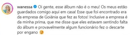 Wanessa ainda especulou sobre o que pode ter acontecido. “Esse que foi encontrado era da empresa de Goiânia que fez as fotos. Inclusive, a empresa é da minha prima, que me disse que eles estavam sentindo falta do álbum e provavelmente algum funcionário fez o descarte por engano”, completou a filha de Zezé Di Camargo.