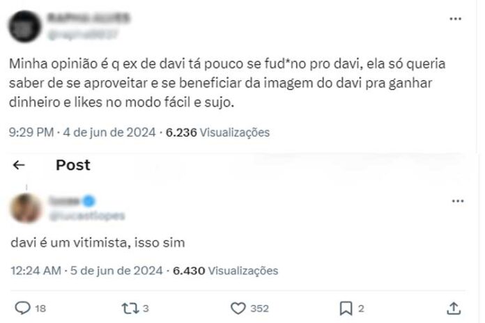 “Minha opinião é que a ex do Davi está pouco se f****. Ela só queria saber de se aproveitar e se beneficiar da imagem do Davi para ganhar dinheiro e likes”, respondeu um internauta. “Davi é vitimista, isso sim”, afirmou outro.