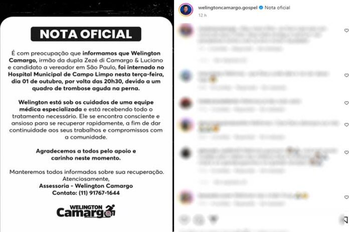 Wellington, que inclusive já foi cantor gospel, está sendo acompanhado de perto por uma equipe especializada e se encontra consciente. “Foi internado no Hospital Municipal de Campo Limpo nesta terça-feira, dia 01 de outubro, por volta das 20h30, devido a um quadro de trombose aguda na perna”, informou a equipe.