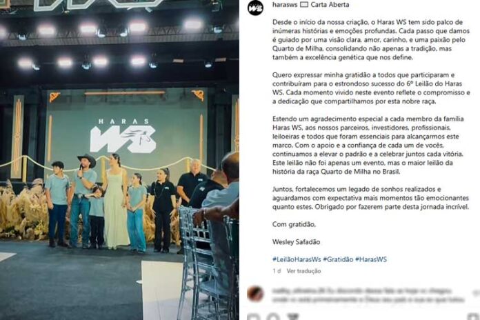 Wesley Safadão fala sobre sucesso de nova edição do leilão Haras WS – Reprodução/Instagram