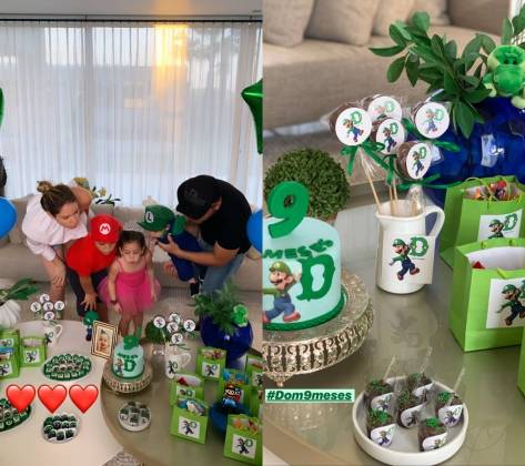 Dom ganhou uma festinha temática que reuniu os pais e seus irmãos, o Yhudi e a Ysis. O tema escolhido para a celebração foi do jogo Mario Bros. O caçula foi vestido de Luigi, Yhudi de Mario e Ysis de Princesa Peach.